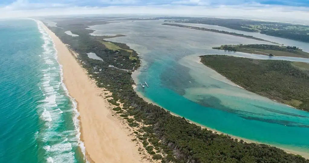 Australia's largest and most beautiful inland waterways, the Gippsland Lakes are a network of lakes, marshes and lagoons covering over 600 square kilometres. The Lakes are separated from the ocean by coastal dunes known as Ninety Mile Beach. Bird and marine life thrive here, with lake dolphins and pelicans frequenting many locations.